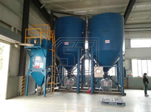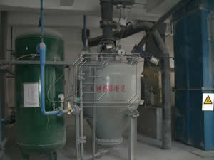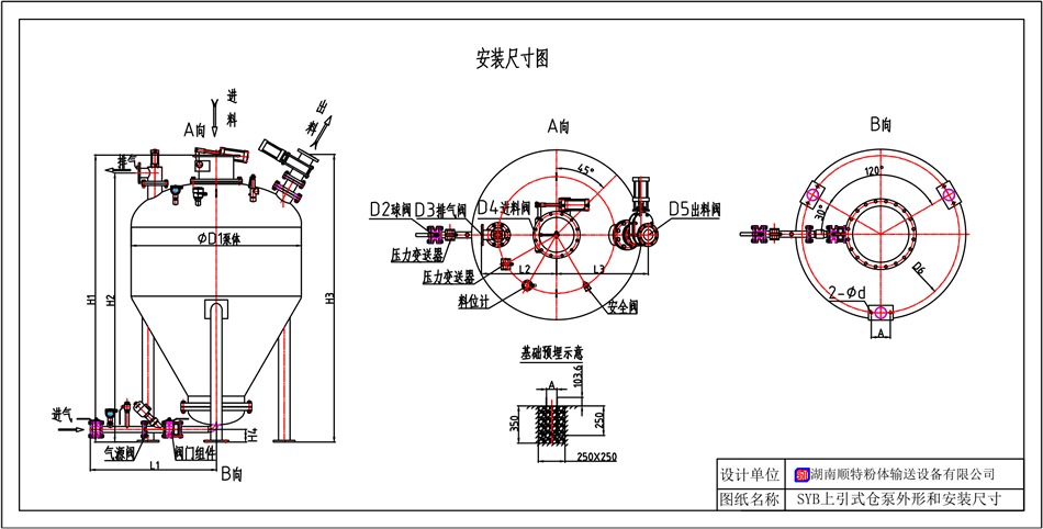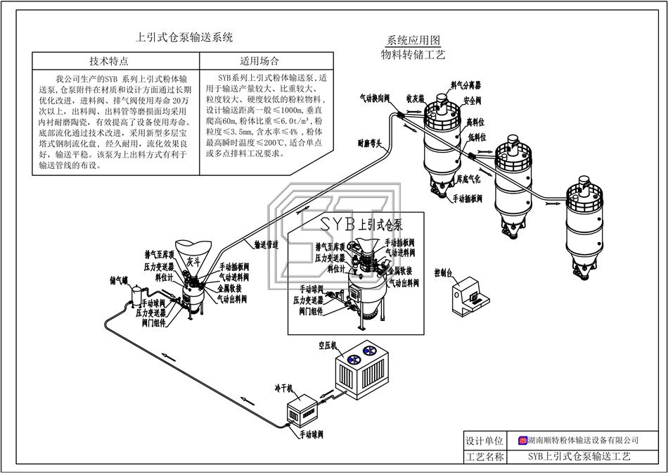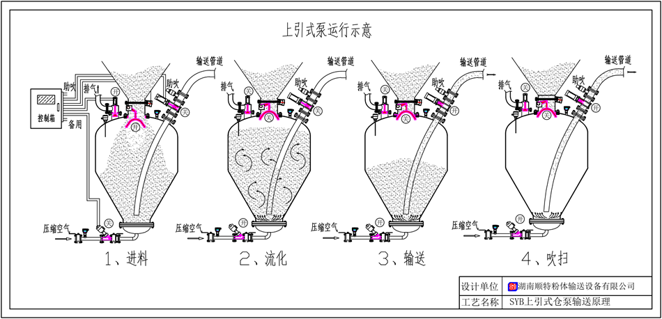 SYB 系列上引式粉體輸送泵運行時, 首先開啟進料閥和排氣閥, 粉體從倉泵進料閥口進入泵體內(nèi), 泵內(nèi)空氣從排氣閥溢岀, 待料位計檢測倉滿時, 進料閥和排氣閥自動關(guān)閉, (為防止料位計損壞設(shè)備失控時,進料設(shè)有備用時間控制)。當儀表檢測到符合輸送壓力值時,氣源控制閥等自動開啟, 待泵內(nèi)壓力上升至設(shè)定值后,自動開啟出料閥和助吹閥, 粉體在壓差和助吹流化作用下高速進入輸送管道, 在輸送中待泵頂壓力下降到一定值時, 表明泵內(nèi)粉體己輸送完畢,自動延時將管道吹掃干凈后關(guān)閉氣源控制閥和助吹閥。即完成一次輸送,進入下一循環(huán)??諝饨?jīng)倉頂料氣分離器過濾后排入大氣,粉體在重力作用下落入受料倉內(nèi),完成粉體輸送。