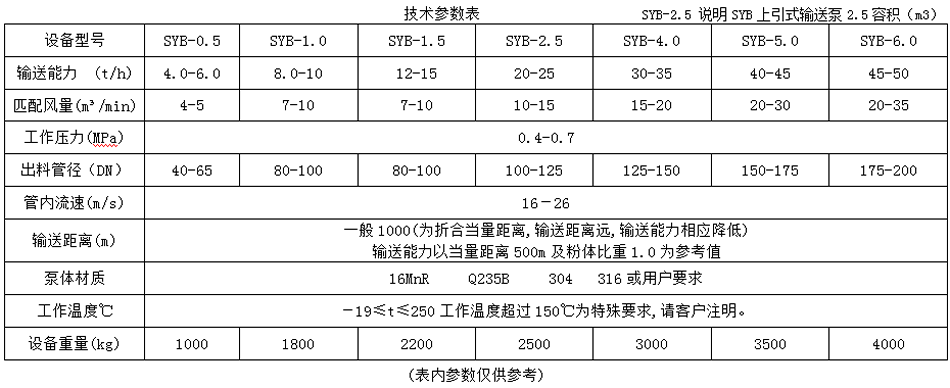 SYB 系列上引式粉體輸送泵,適用于輸送產(chǎn)量較大、比重較大、粒度較大、硬度較低的粉粒物料, 設(shè)計當量輸送距離一般≤1000 m,垂直爬高60m, 粉體比重≤6.0 t/m³, 粉粒度≤5.0mm, 含水率≤3% ,粉體瞬時溫度≤200℃,適合單點或多點排料工況要求。